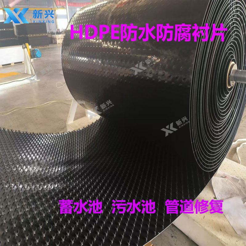 HDPE防水防腐衬片,污水池内壁防腐板,高密度聚乙烯防水防渗多点锚固板以共混聚乙烯为主要原材料,主要用于管道、蓄水池、污水池内壁、沉淀池、垃圾填埋场、矿洞废水等需重防腐的混凝土构筑物,也用于排水管道及老旧市政管道内壁修复等。