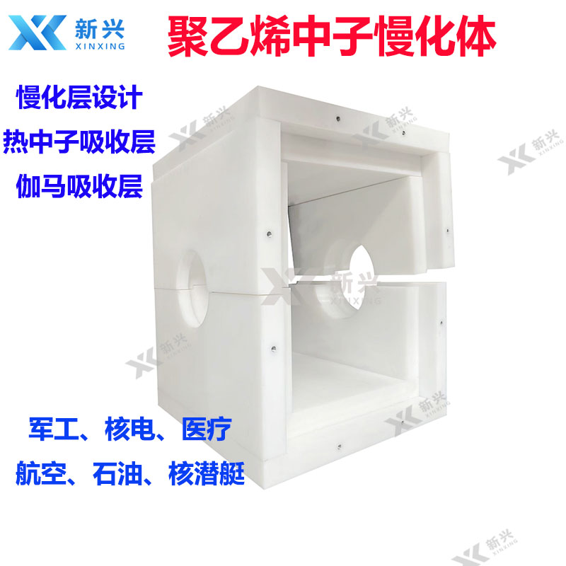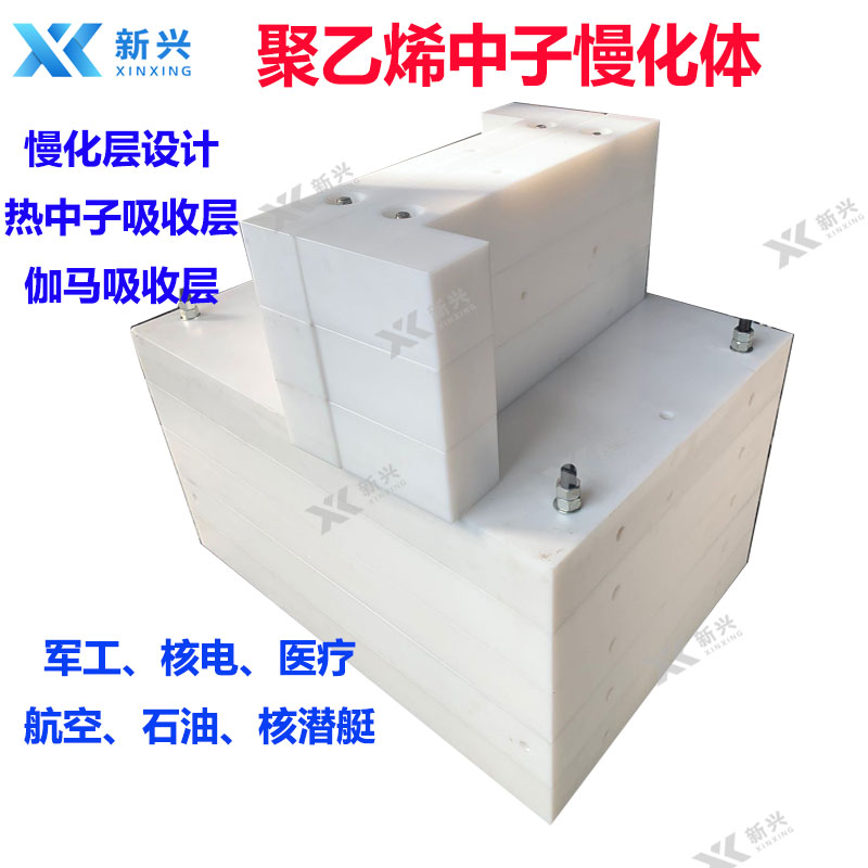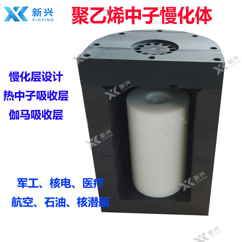 山东新兴定制生产含硼高密度聚乙烯中子慢化体,可加工屏蔽球体、罐体、方形屏蔽体、屏蔽门及屏蔽门体、房体、墙体等,该材料具有材质轻、耐腐蚀、易加工、耐辐照、无污染等特点,便于简化屏蔽体结构,是替代石蜡、混凝土、铅板等的传统复合屏蔽新材料,该材料已经广泛用于核电、JUN工、航空、石油、核潜艇等领域以及中子科研实验室等。